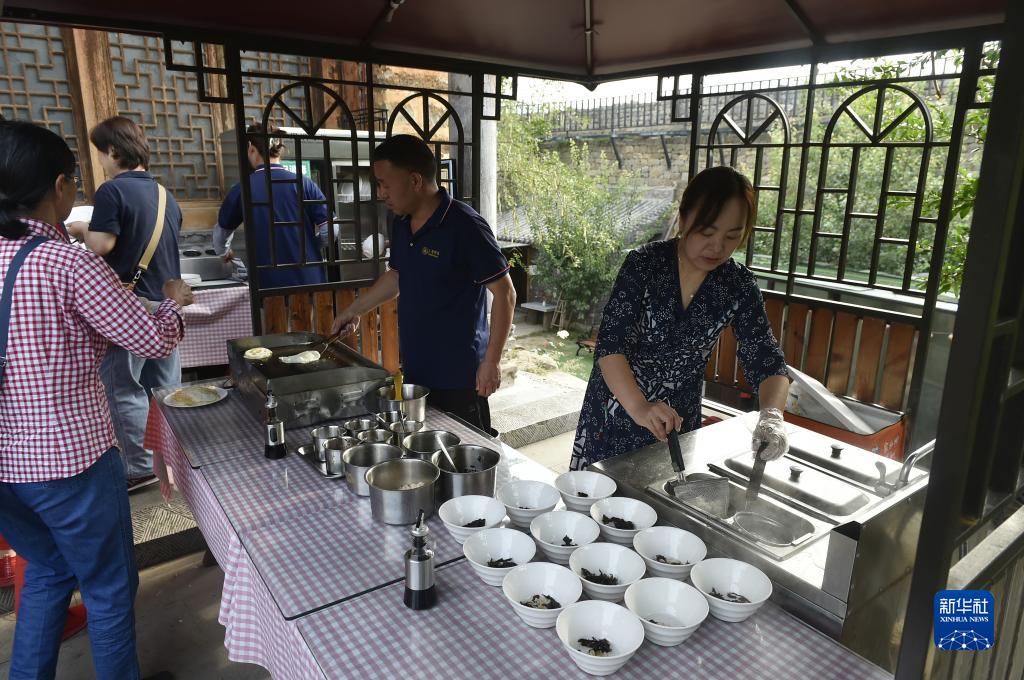 8月18日,在汝州市大峪鎮袁窯村,云堡妙境民宿的工作人員為入住客人準備早餐。