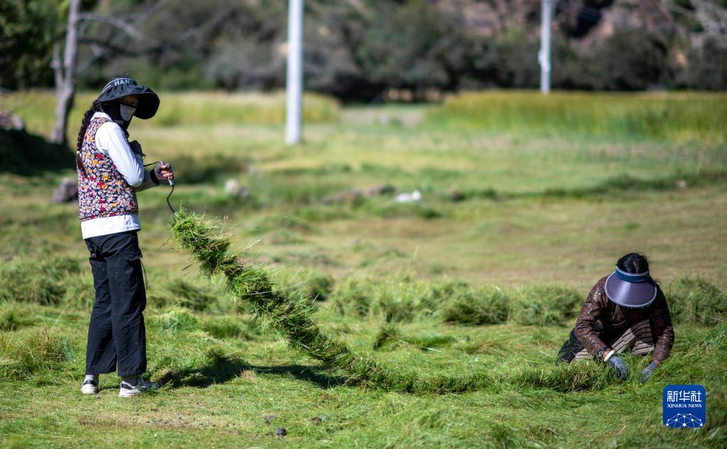目前,西藏各地進(jìn)入秋收時(shí)節。西藏昌都市邊壩縣的農民抓緊收割青稞和牧草,確保顆粒歸倉。