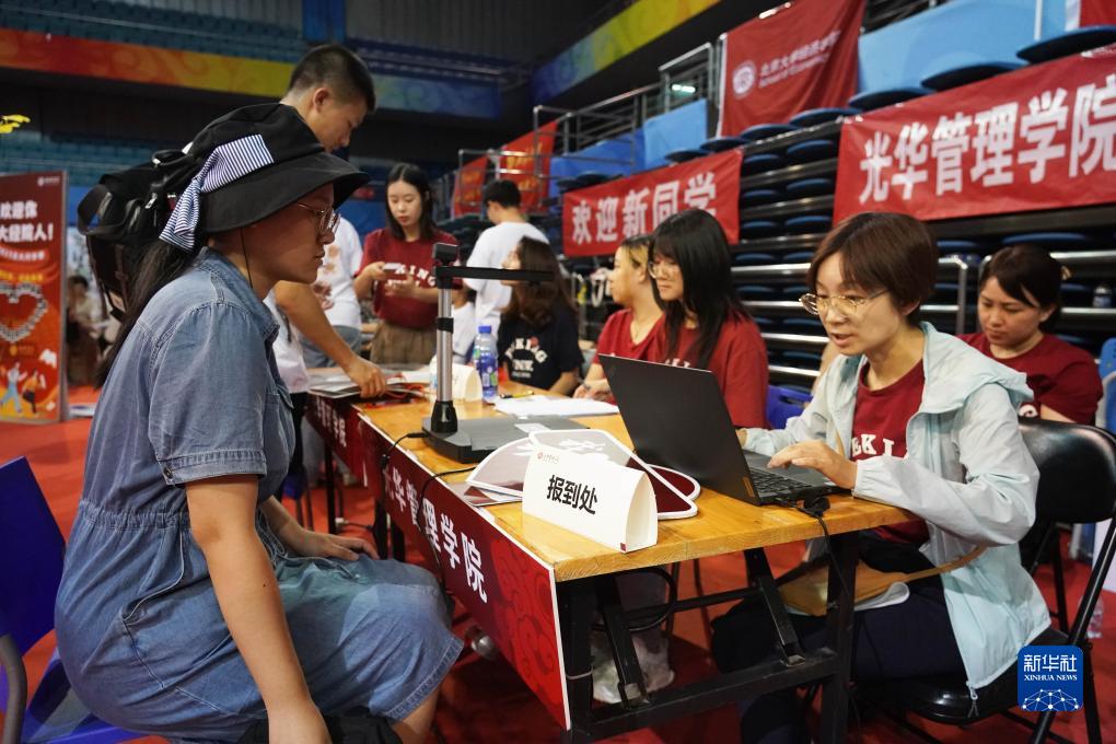 8月19日,在北京大學(xué)邱德拔體育館,一名光華管理學(xué)院的2023級本科新生(左一)報到。