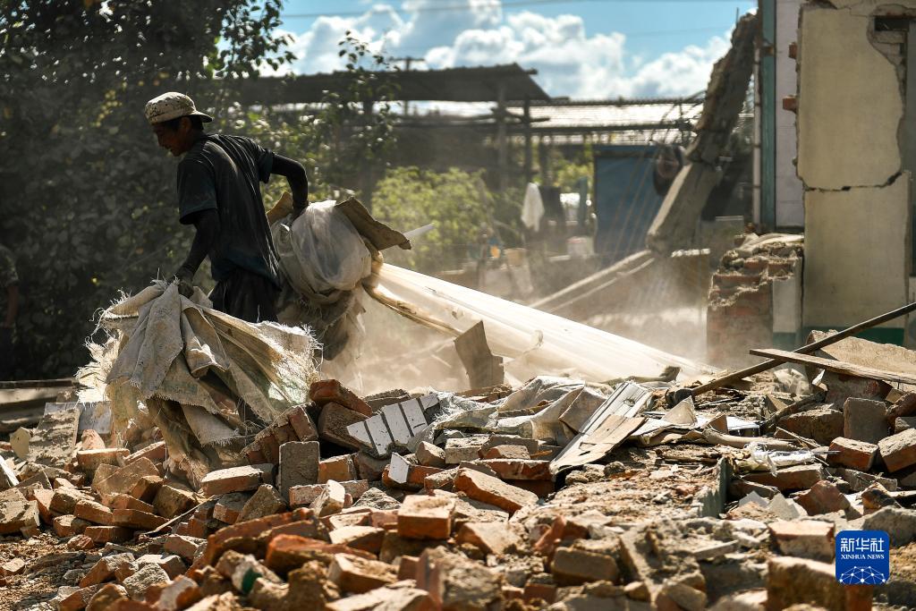 工作人員對舒蘭市開(kāi)原鎮模范村的受損房屋進(jìn)行拆除重建工作(8月16日攝)。