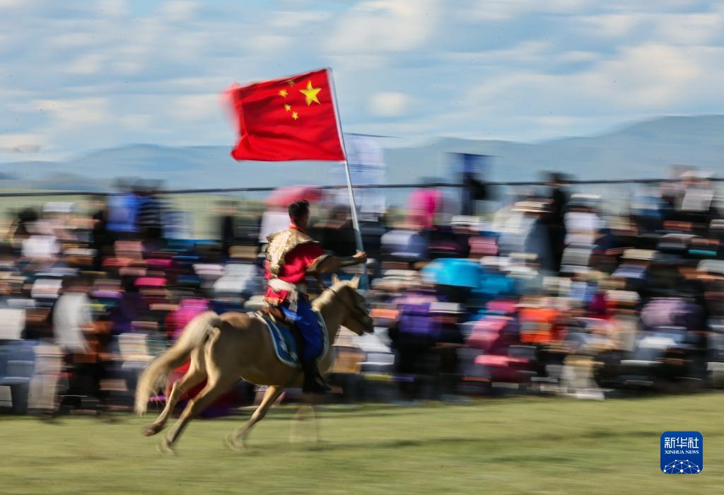 8月18日,在蒙古國泰吉山谷,文化節開(kāi)幕式上一名蒙古國騎手展示中國國旗。