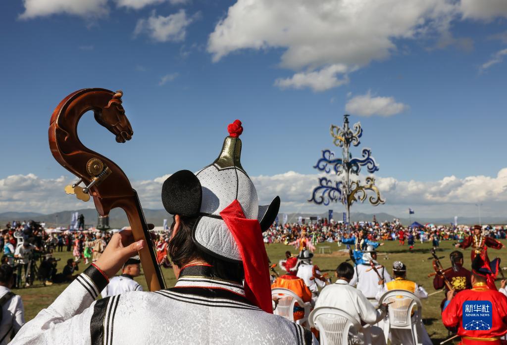 8月18日,在蒙古國泰吉山谷,文化節開(kāi)幕式上演員在演奏馬頭琴。