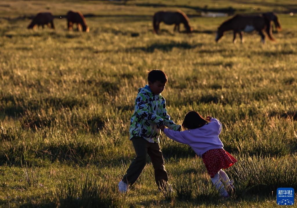 這是8月18日在蒙古國泰吉山谷拍攝的在夕陽(yáng)中嬉戲的孩子。
