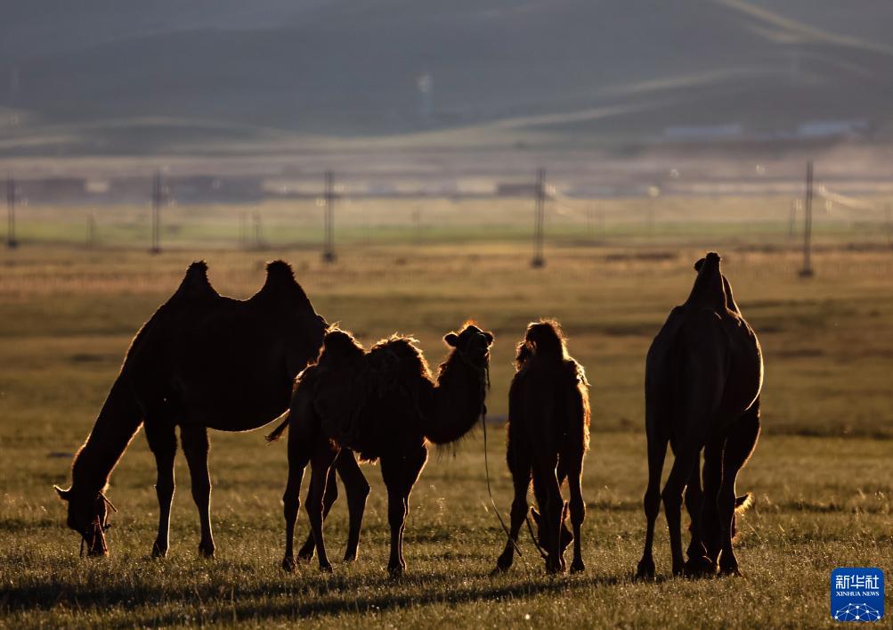 這是8月18日在蒙古國泰吉山谷拍攝的沐浴在夕陽(yáng)里的駱駝。