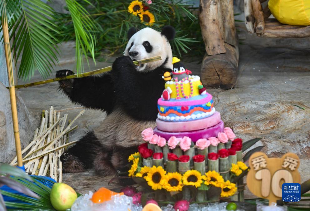 當日,位于??谑械暮D蠠釒б吧鷦?dòng)植物園為園內大熊貓“貢貢”和“舜舜”舉行10歲生日慶?;顒?dòng)。工作人員用冰塊、竹筍、水果等制作生日大餐,為它們慶生。