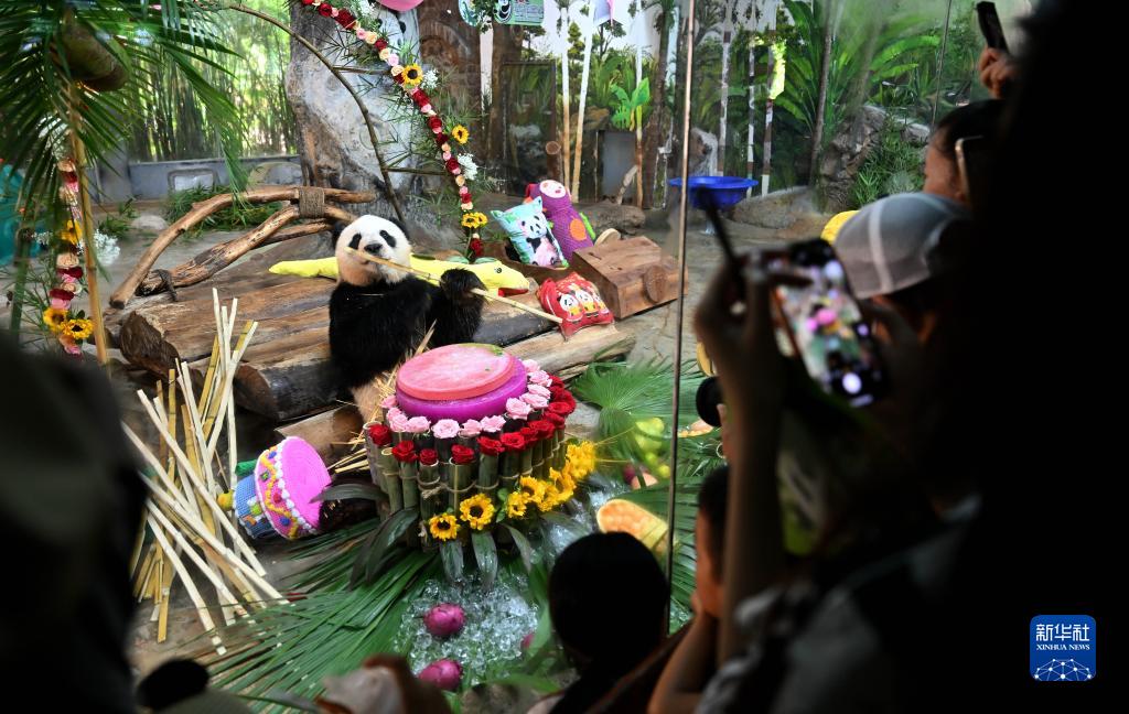 當日,位于??谑械暮D蠠釒б吧鷦?dòng)植物園為園內大熊貓“貢貢”和“舜舜”舉行10歲生日慶?;顒?dòng)。工作人員用冰塊、竹筍、水果等制作生日大餐,為它們慶生。
