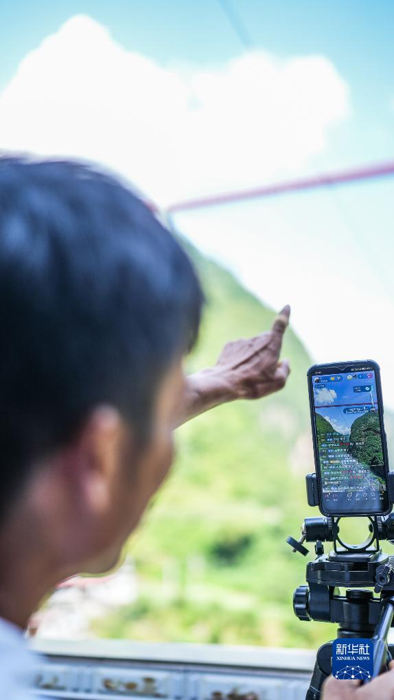 馬選軍在直播介紹北盤(pán)江大橋(8月16日攝)。