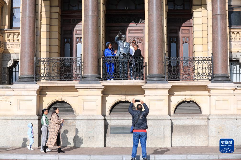 8月13日,游客在南非開(kāi)普敦與曼德拉雕像合影。