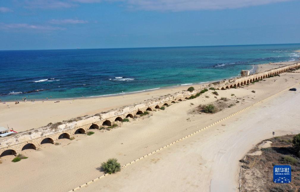 這是8月20日在以色列城市凱撒里亞拍攝的古羅馬渡槽遺址(無(wú)人機照片)。