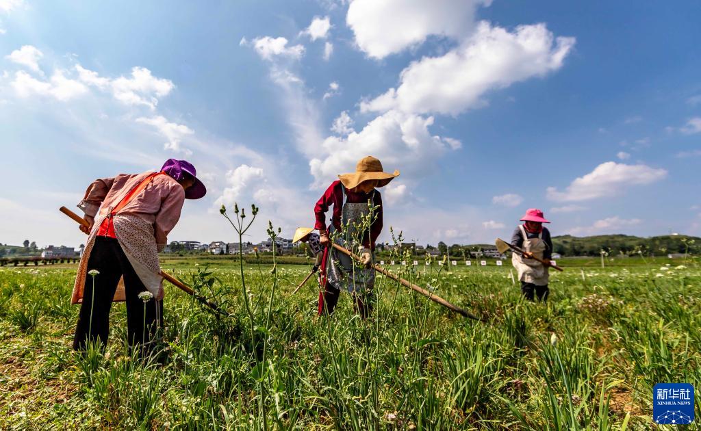 村民在貴州省黔西市林泉鎮海子村韭菜種植示范基地鋤草(8月20日攝)。
