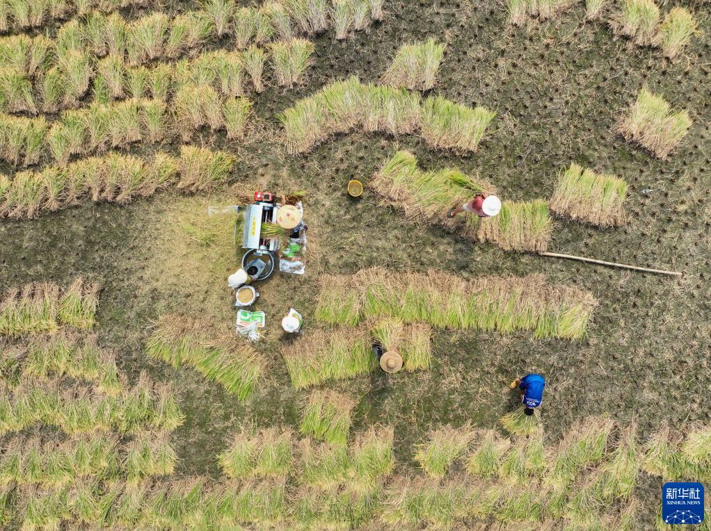 8月20日,在湖南省永州市道縣清塘鎮廖家村,農民在收獲水稻(無(wú)人機照片)。