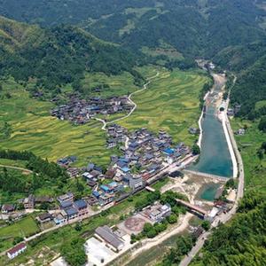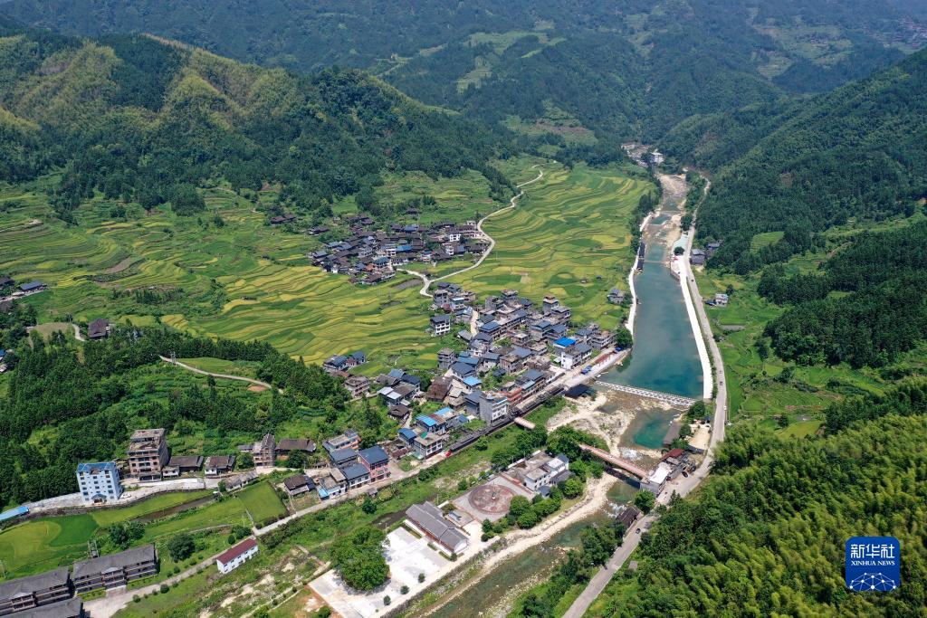 融水苗族自治縣香粉鄉雨卜村整治后的河道、村莊、旅游設施等(8月19日攝,無(wú)人機照片)。近年來(lái),雨卜村充分利用粵桂協(xié)作幫扶資金,通過(guò)整治河道、修繕古建筑等,發(fā)展鄉村旅游產(chǎn)業(yè),打造鄉村旅游示范村。