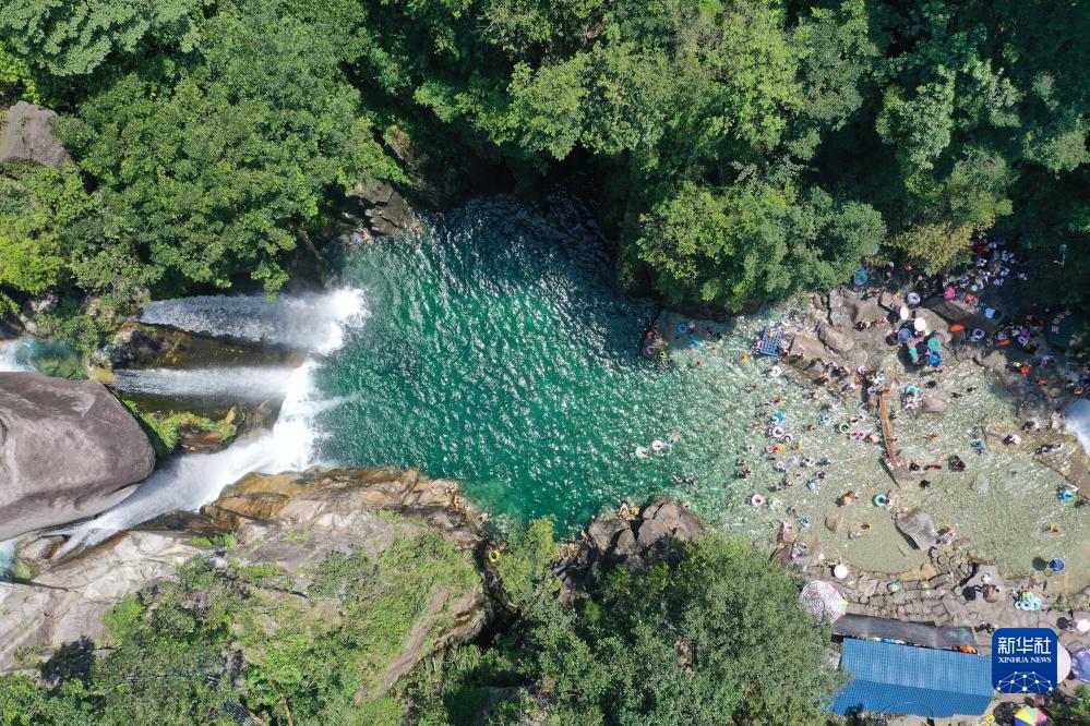 游客在融水苗族自治縣香粉鄉中坪村三友瀑布景區戲水消暑(8月19日攝,無(wú)人機照片)。近年來(lái),中坪村充分利用粵桂協(xié)作幫扶資金,升級改造景區基礎設施,大力發(fā)展鄉村旅游產(chǎn)業(yè)。