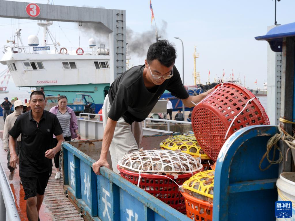 8月16日,商戶(hù)在浙江省舟山市普陀區舟山國際水產(chǎn)城運送剛從漁船上卸下的梭子蟹。新華社記者 翁忻旸 攝