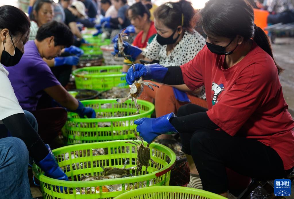 8月17日,在浙江省舟山市普陀區舟山國際水產(chǎn)城,工作人員按級分揀梭子蟹。新華社記者 韓傳號 攝