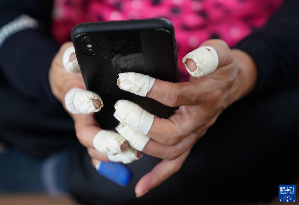 8月17日,一名來(lái)自安徽阜陽(yáng)的務(wù)工人員在分揀梭子蟹后休息,她在手指上纏滿(mǎn)膠布防止被蟹鉗夾傷。新華社記者 韓傳號 攝
