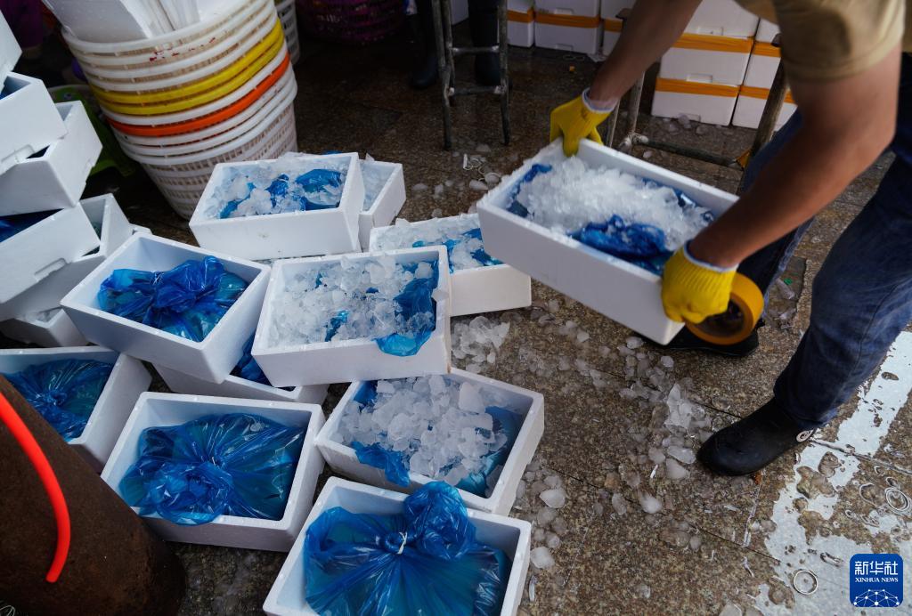8月17日,加冰后的新鮮梭子蟹在浙江省舟山市普陀區舟山國際水產(chǎn)城等候打包。新華社記者 韓傳號 攝