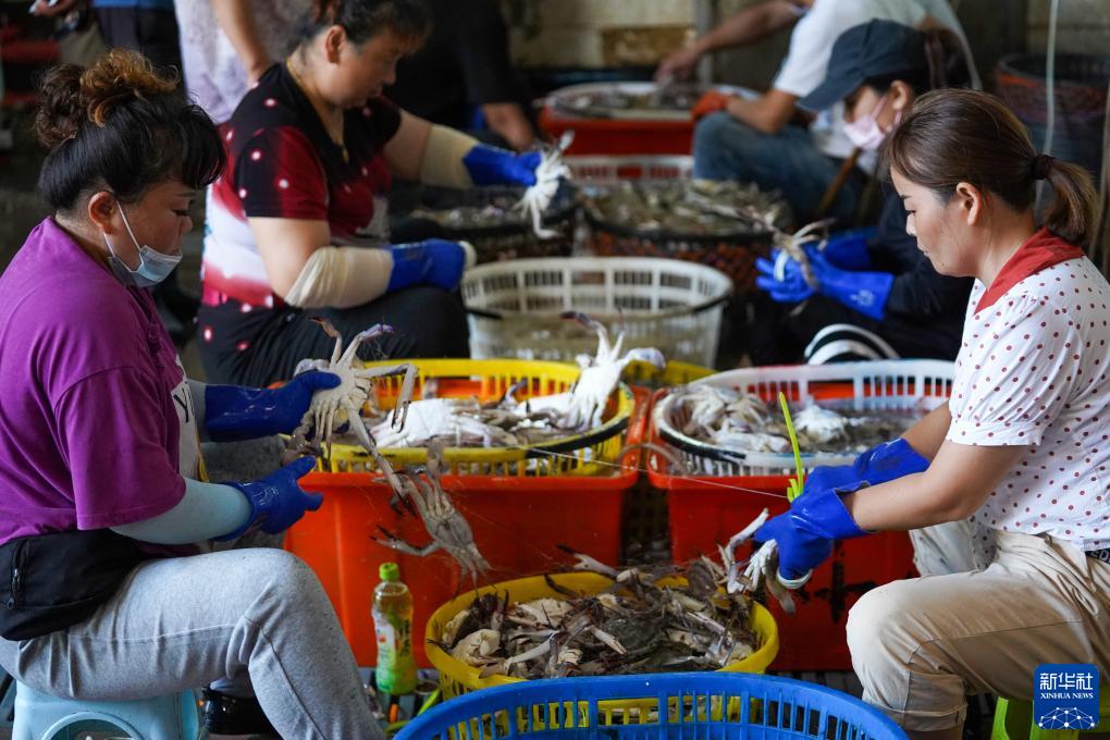 8月20日,在浙江省舟山市普陀區舟山國際水產(chǎn)城,工作人員按級分揀梭子蟹。新華社發(fā)(鄒訓永 攝)