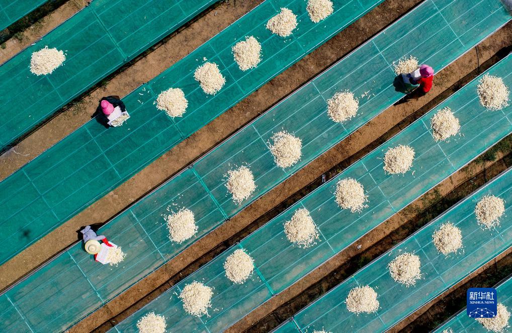 8月21日,工人在鄂托克前旗城川鎮一家副食品公司晾曬白蘿卜條(無(wú)人機照片)。