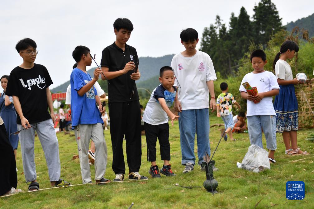8月20日,孩子們在2023大元社鄉村青少年藝術(shù)節中體驗投壺游戲。