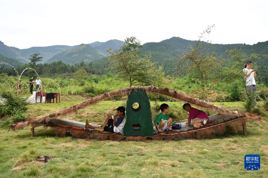 8月20日,孩子們在裝置藝術(shù)作品“眼睛屋”休息玩耍。