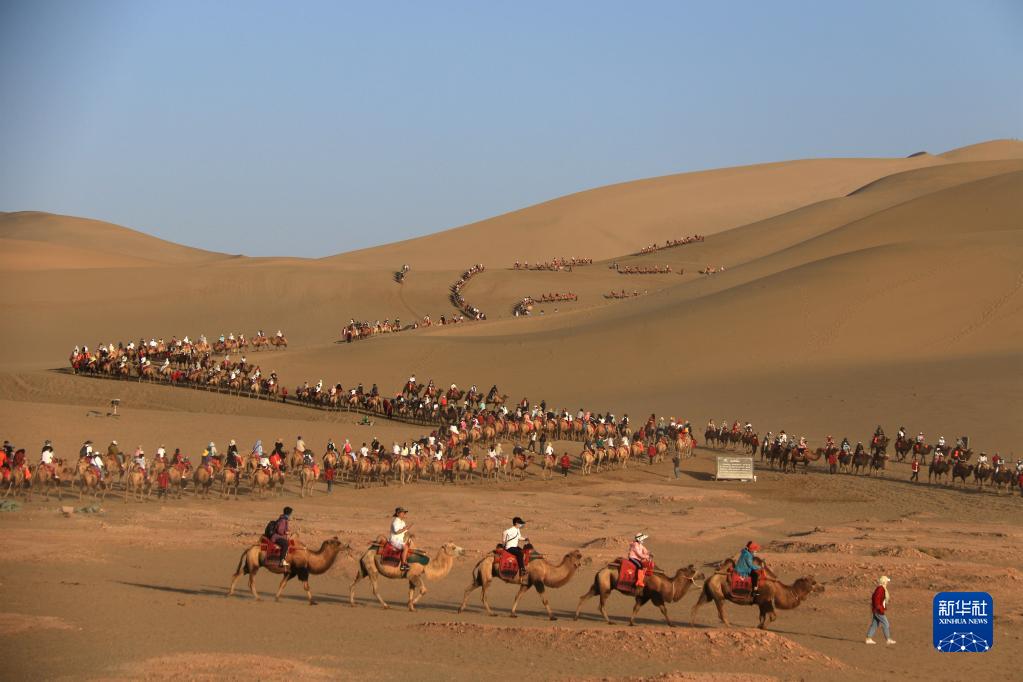 8月20日,游客在甘肅省敦煌市鳴沙山月牙泉景區游覽。