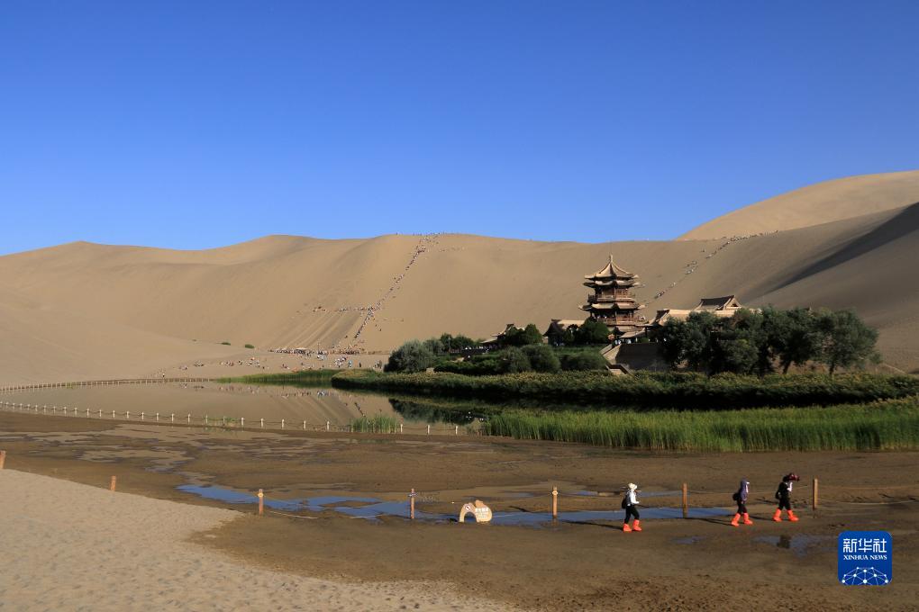 初秋時(shí)節,甘肅省敦煌市碧空如洗,鳴沙山月牙泉景區景色如畫(huà),引人入勝。