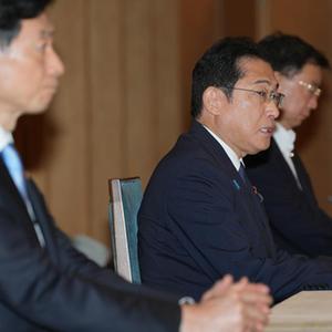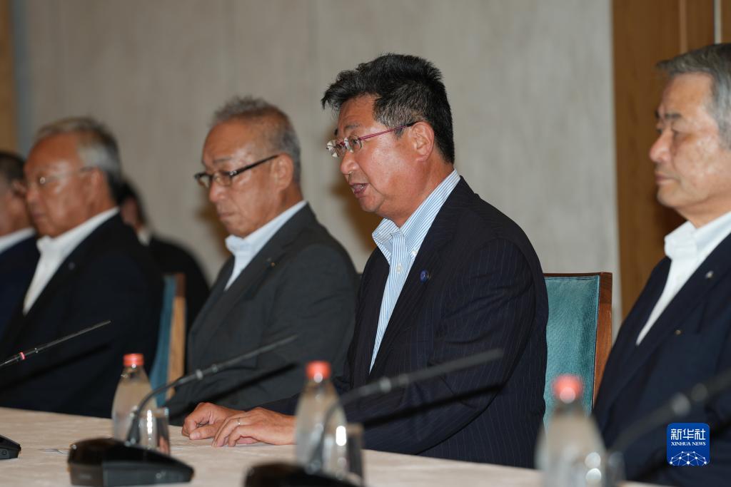 8月21日,在日本東京首相官邸,日本全國漁業(yè)協(xié)會(huì )聯(lián)合會(huì )會(huì )長(cháng)坂本雅信(右二)在與日本首相岸田文雄會(huì )見(jiàn)時(shí)發(fā)言。