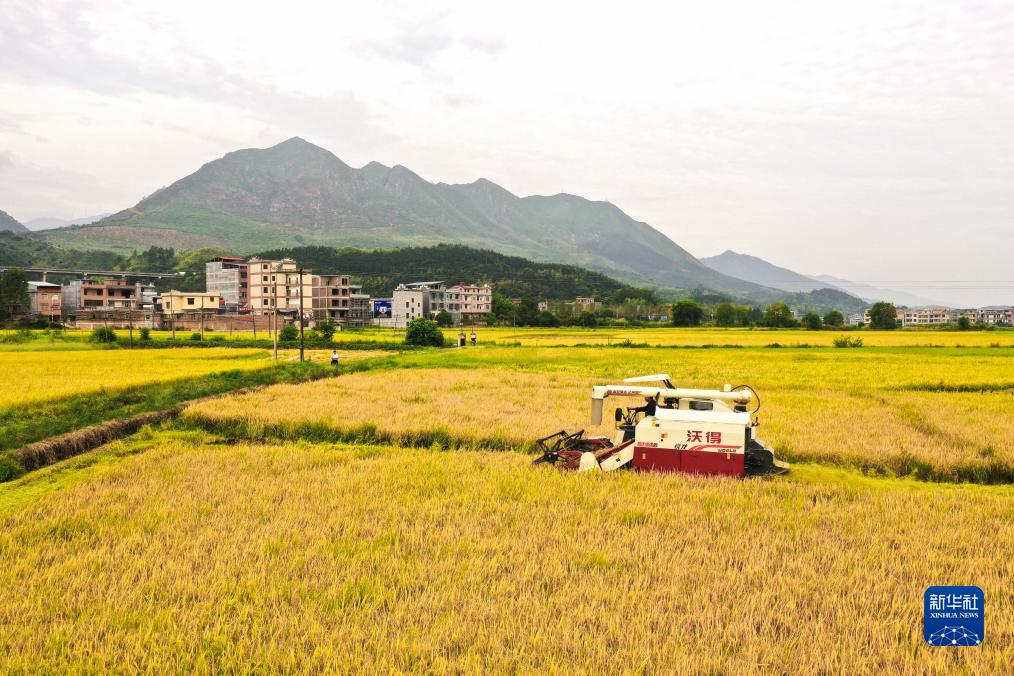 8月21日,湖南省常寧市廟前鎮泉井村農民駕駛農機在收獲水稻(無(wú)人機照片)。