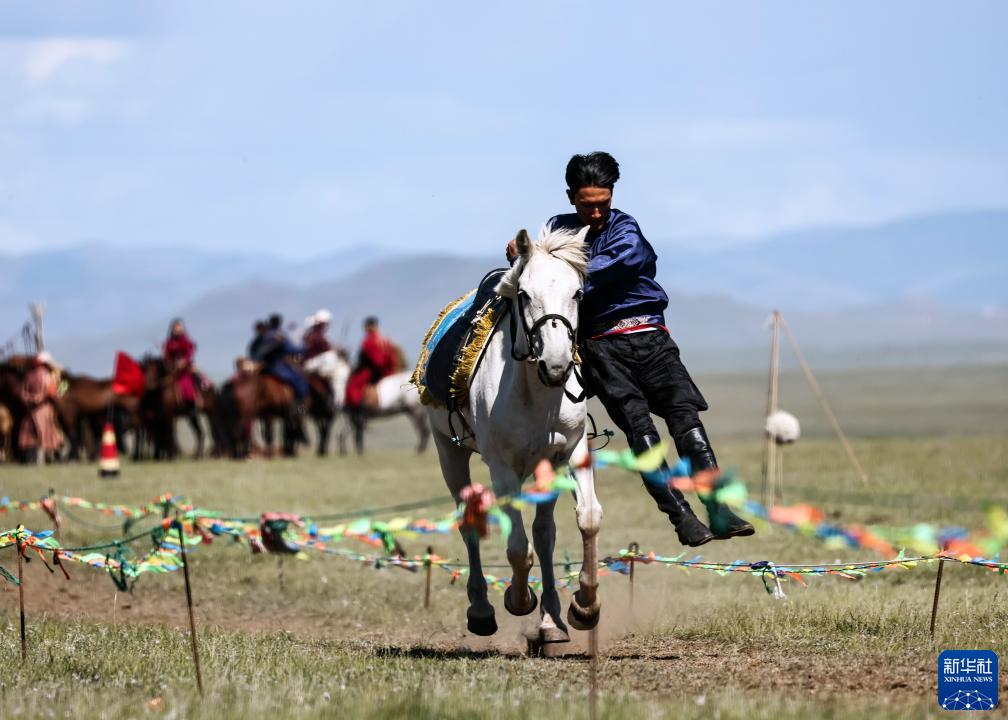 8月19日,在蒙古國泰吉山谷,選手在蒙古國“游牧民族”世界文化節上參加馬術(shù)表演。