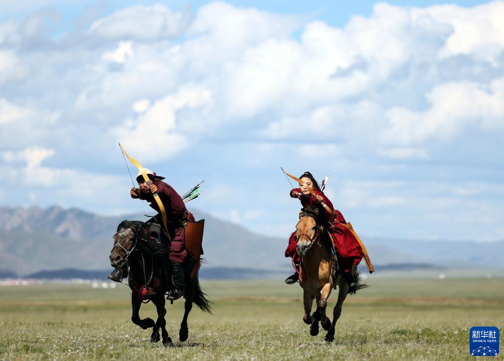 8月19日,在蒙古國泰吉山谷,選手在蒙古國“游牧民族”世界文化節上展示騎馬射箭。