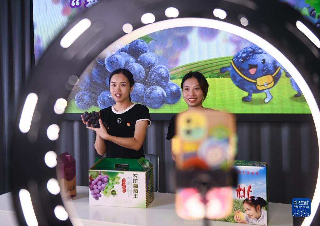 8月22日,黨員志愿者在嘉興市南湖區電商產(chǎn)業(yè)園的共富工坊直播間進(jìn)行葡萄助農直播銷(xiāo)售。