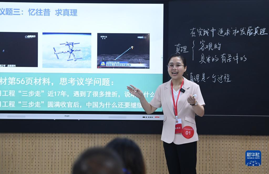 8月22日,第四屆全國中小學(xué)青年教師教學(xué)競賽決賽,中學(xué)思想政治組的一名教師在進(jìn)行教學(xué)展示。