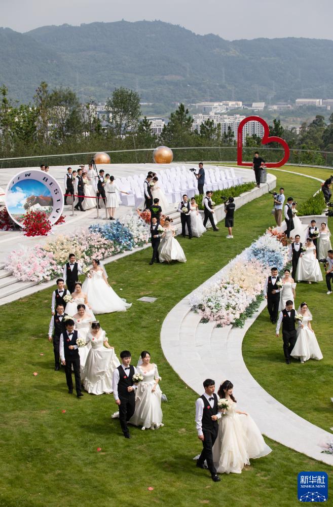 8月22日,新人列隊來(lái)到三江新區“三江之眼”參加集體婚禮。