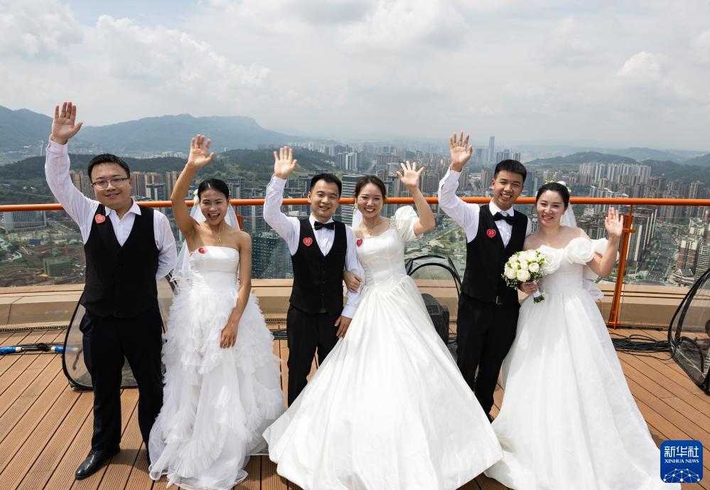 8月22日,參加集體婚禮的新人在三江新區“三江之眼”520觀(guān)景平臺合影留念。