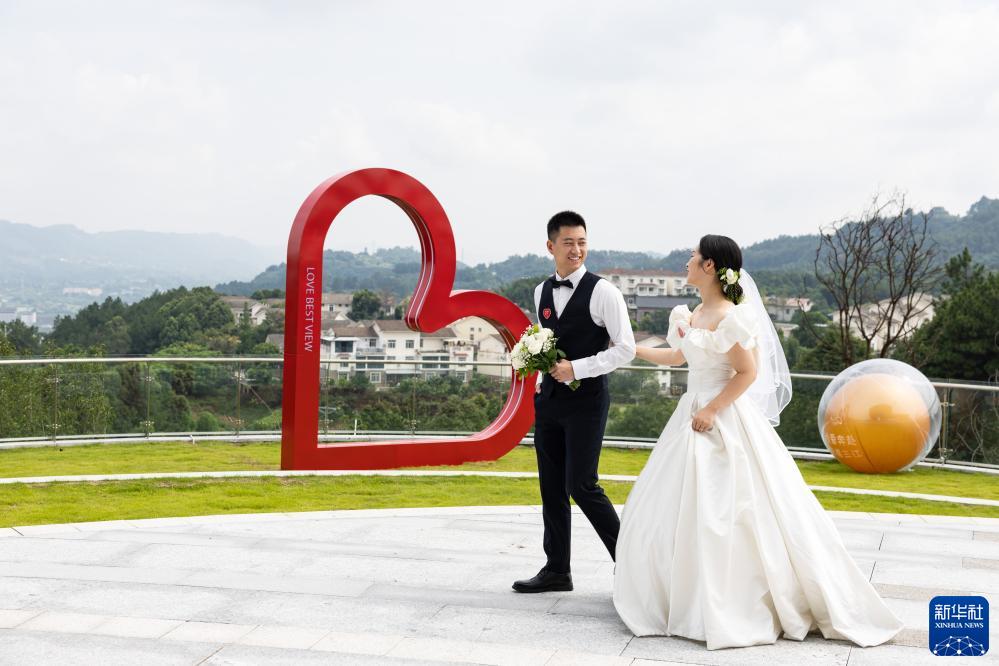 8月22日,一對參加集體婚禮的新人在三江新區“三江之眼”拍照留影。