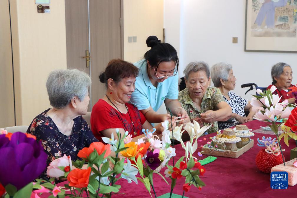 8月21日,老人在山東省濱州市沾化區大高鎮國昌怡心園的護工指導下編織手工作品。