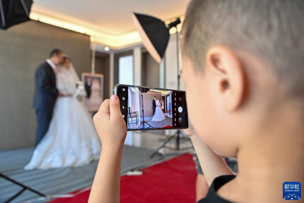 8月22日,小朋友用手機記錄爺爺奶奶的婚紗照拍攝過(guò)程。