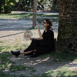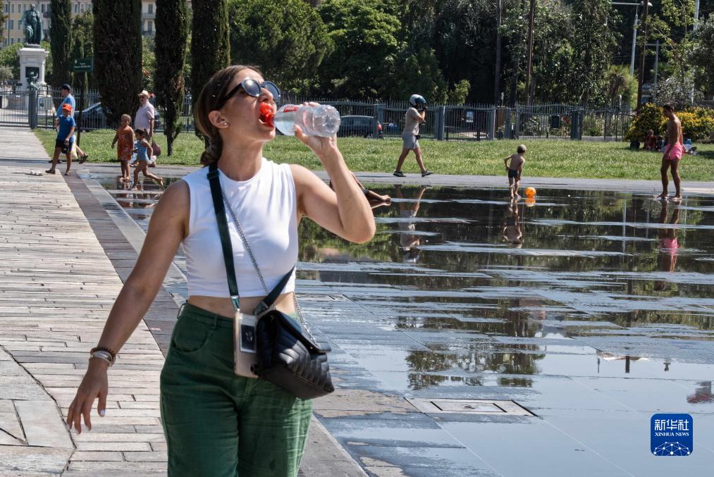8月22日,一名女子在法國南部城市尼斯街頭邊走邊喝水。
