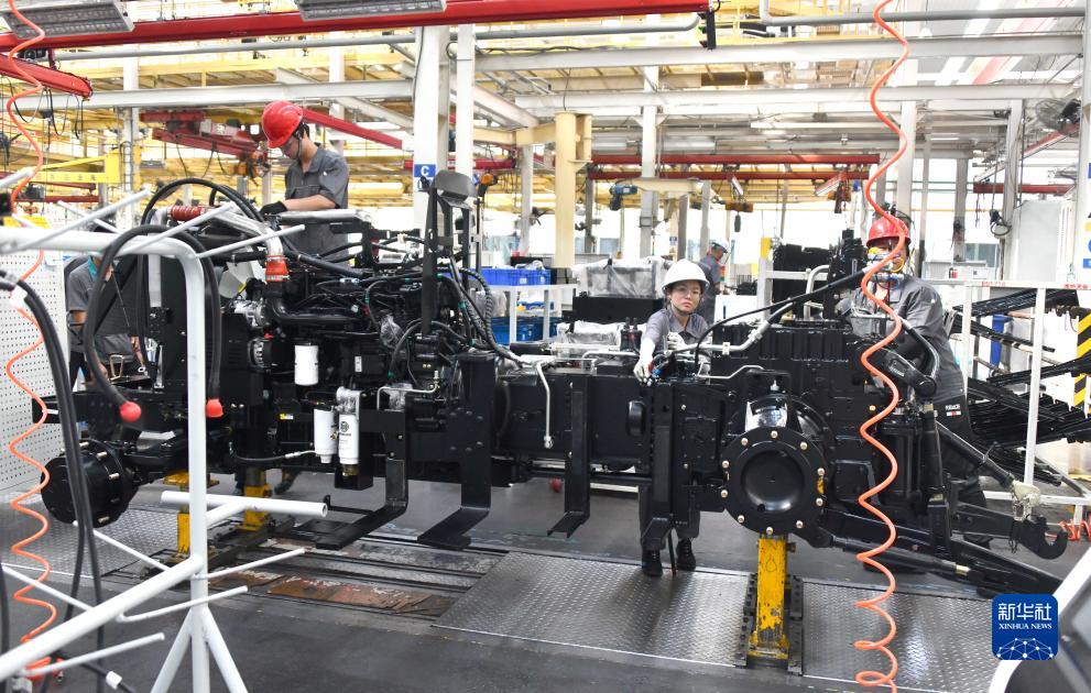 8月22日,在位于山東省濰坊市坊子區的濰柴雷沃智慧農業(yè)科技股份有限公司,工人在車(chē)間組裝生產(chǎn)農機設備。