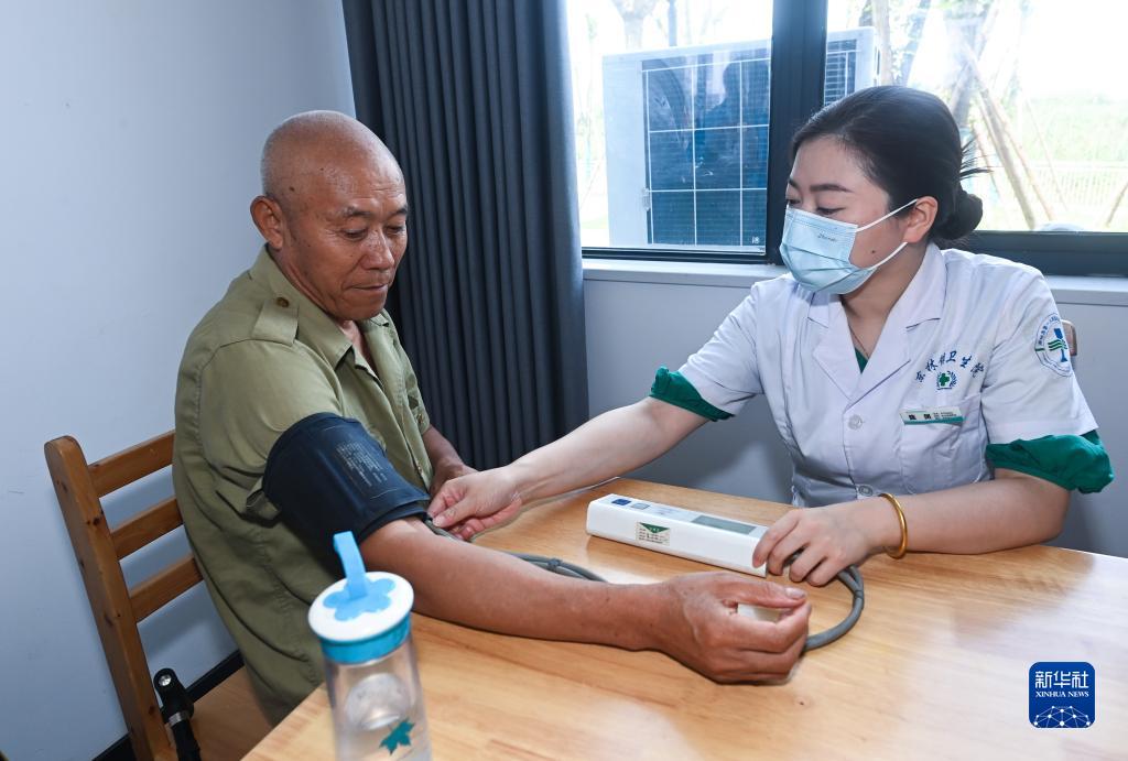8月23日,在湖州市吳興區東林鎮東華村文化禮堂,東林鎮衛生院黨員志愿者給老人測量血壓。