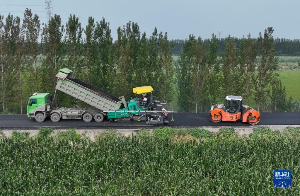 8月23日,工人在唐山市豐南區陡河沿岸鄉村公路建設工地施工(無(wú)人機照片)。