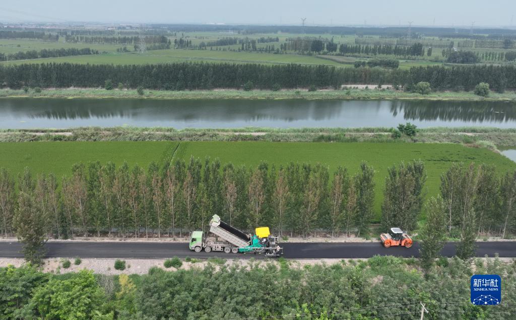 8月23日,工人在唐山市豐南區陡河沿岸鄉村公路建設工地施工(無(wú)人機照片)。