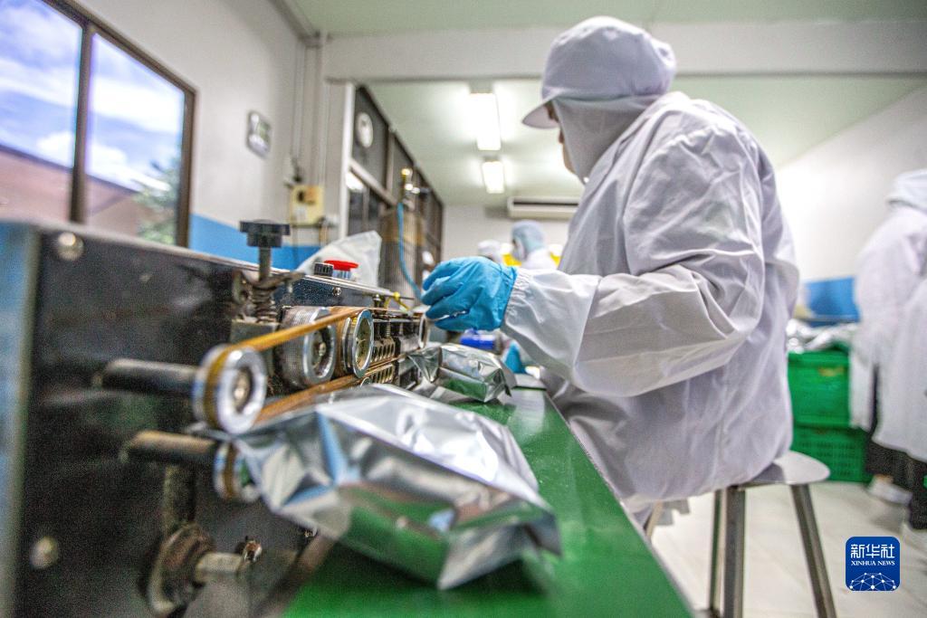 8月17日,在泰國尖竹汶府,尖竹汶果品公司工作人員包裝榴蓮干。新華社記者 王騰 攝
