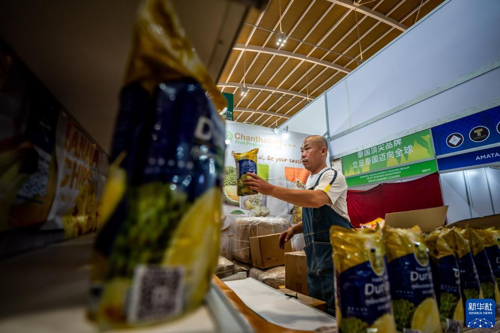 8月14日,泰國華商陳杰在南博會(huì )開(kāi)幕前在展柜上擺放榴蓮干。新華社記者 胡超 攝
