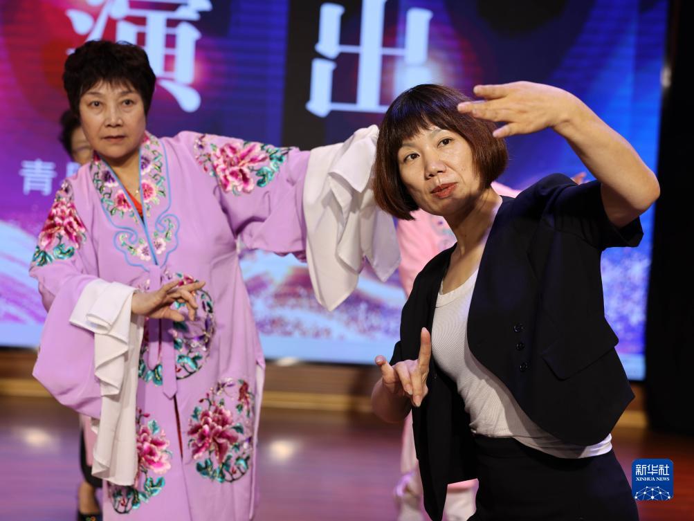 8月23日,在河北省滄州市青縣市民文化活動(dòng)中心夢(mèng)想劇場(chǎng),戲曲表演老師指導戲曲愛(ài)好者進(jìn)行練習。