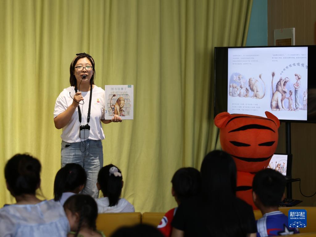 8月23日,志愿者在河北省滄州市青縣市民文化活動(dòng)中心少兒閱覽室訓練孩子們的閱讀和語(yǔ)言表達能力。