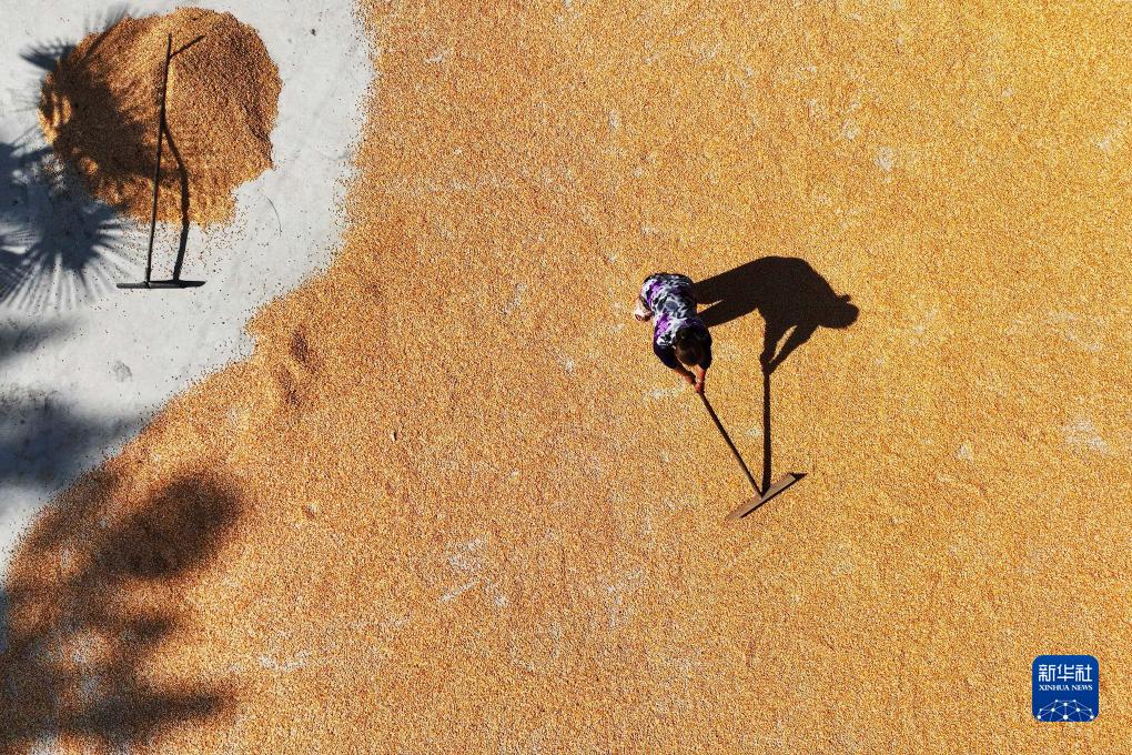 8月23日,重慶市黔江區沙壩鎮三臺村村民在晾曬玉米(無(wú)人機照片)。