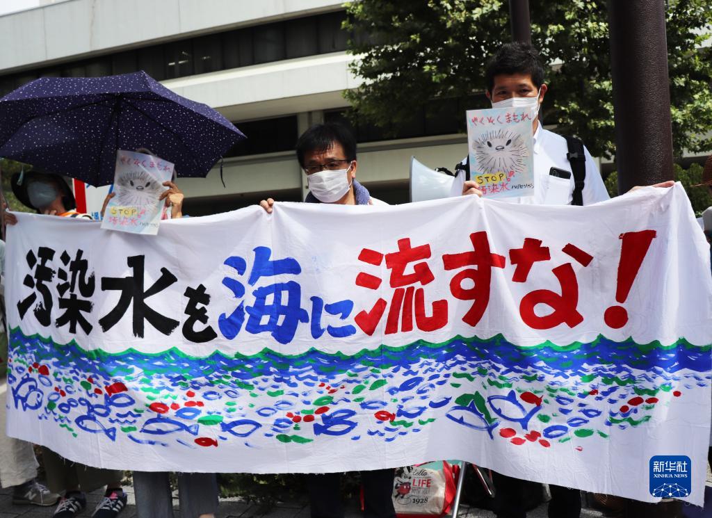 8月24日,日本民眾手持“不許將污染水排入大?!钡葮苏Z(yǔ)在東京電力公司總部前集會(huì ),抗議日本政府和東電公司無(wú)視民意啟動(dòng)核污染水排海。