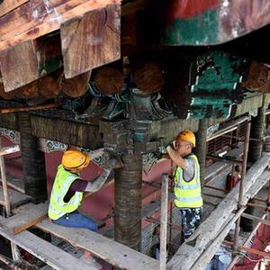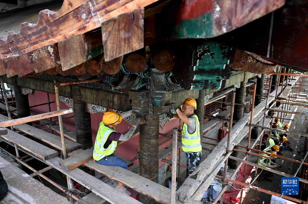 8月24日,施工人員在河北正定古城南城門(mén)樓施工現場(chǎng)進(jìn)行修繕作業(yè)。